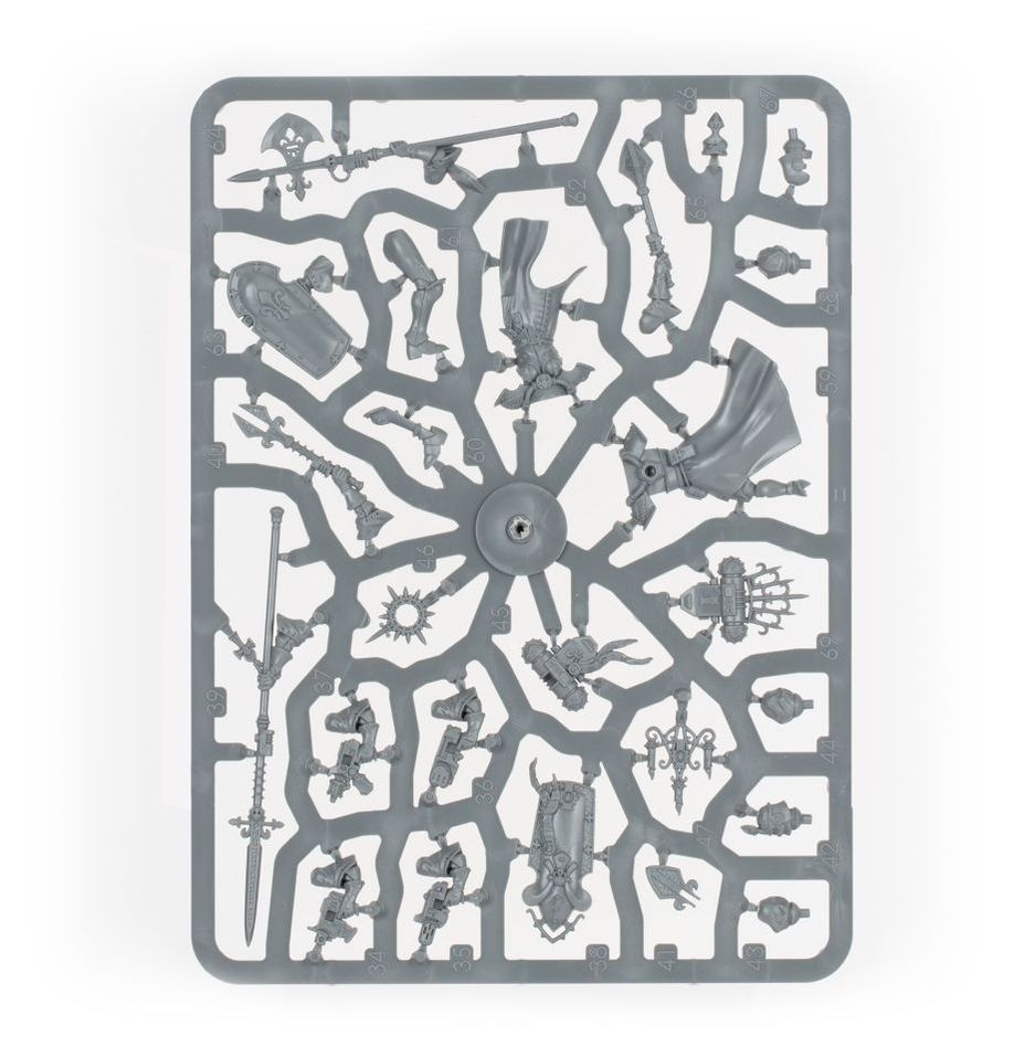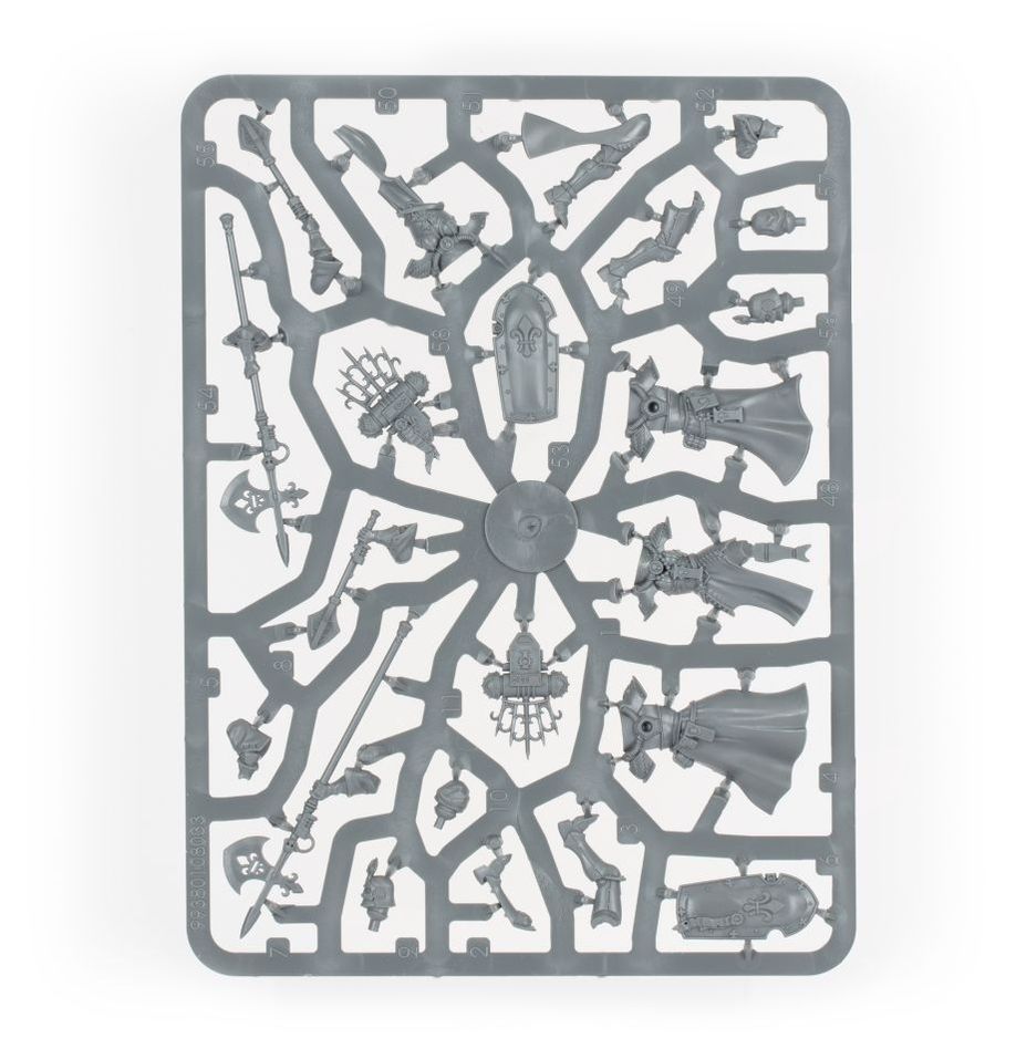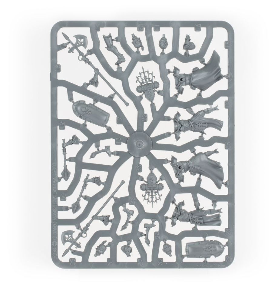 The kit is comprised of 69 plastic components, with which you can assemble five Celestian Sacresants, one of which may be assembled as a Celestian Superior, and is supplied with 5x Citadel 32mm Round Bases. This kit includes options for hooded or helmeted heads, and may be equipped with either anointed halberds or hallowed maces.