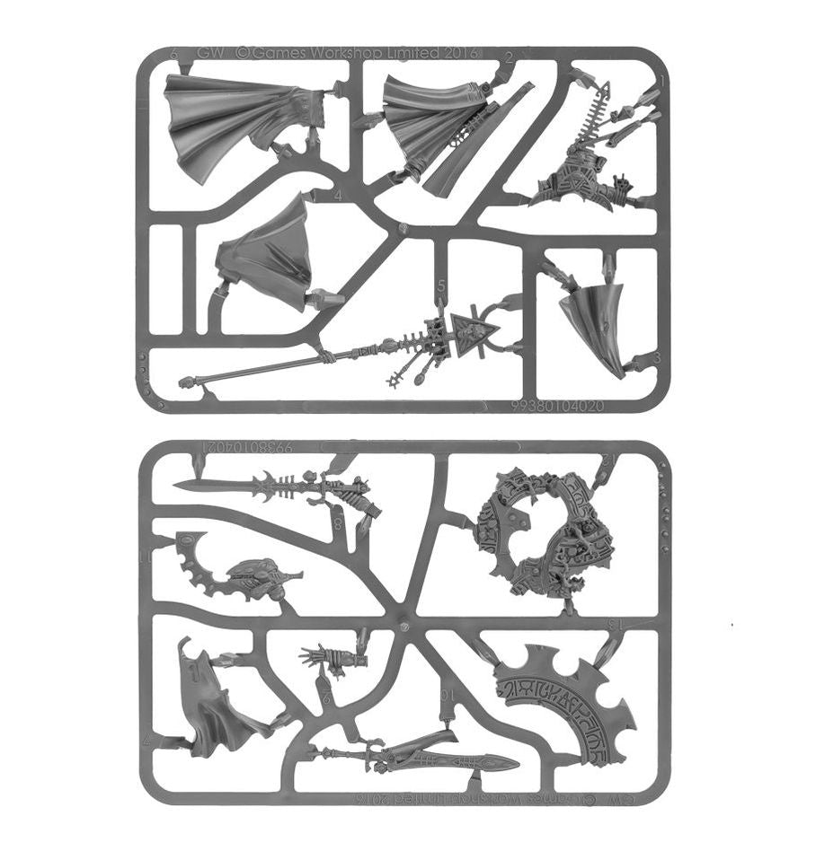This multi-part plastic kit contains the components necessary to assemble Eldrad Ulthran. Standing tall, wielding a beautifully-jeweled witchblade and the Staff of Ulthamar, he wears impressively elaborate armour reflecting his status as high Farseer. Patterns of psycho-receptive wraithbone runes are secreted about the model – Eldrad is said to have devised over a dozen distinct runes. Even his billowing cloak is inscribed with runes, demonstrating his psychic might – as a backup, should his psychic abilities fail, he carries a shuriken pistol also.