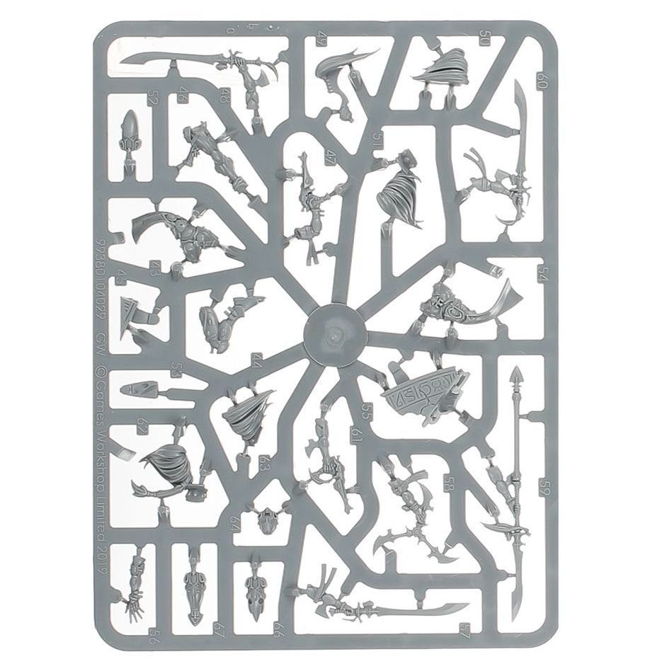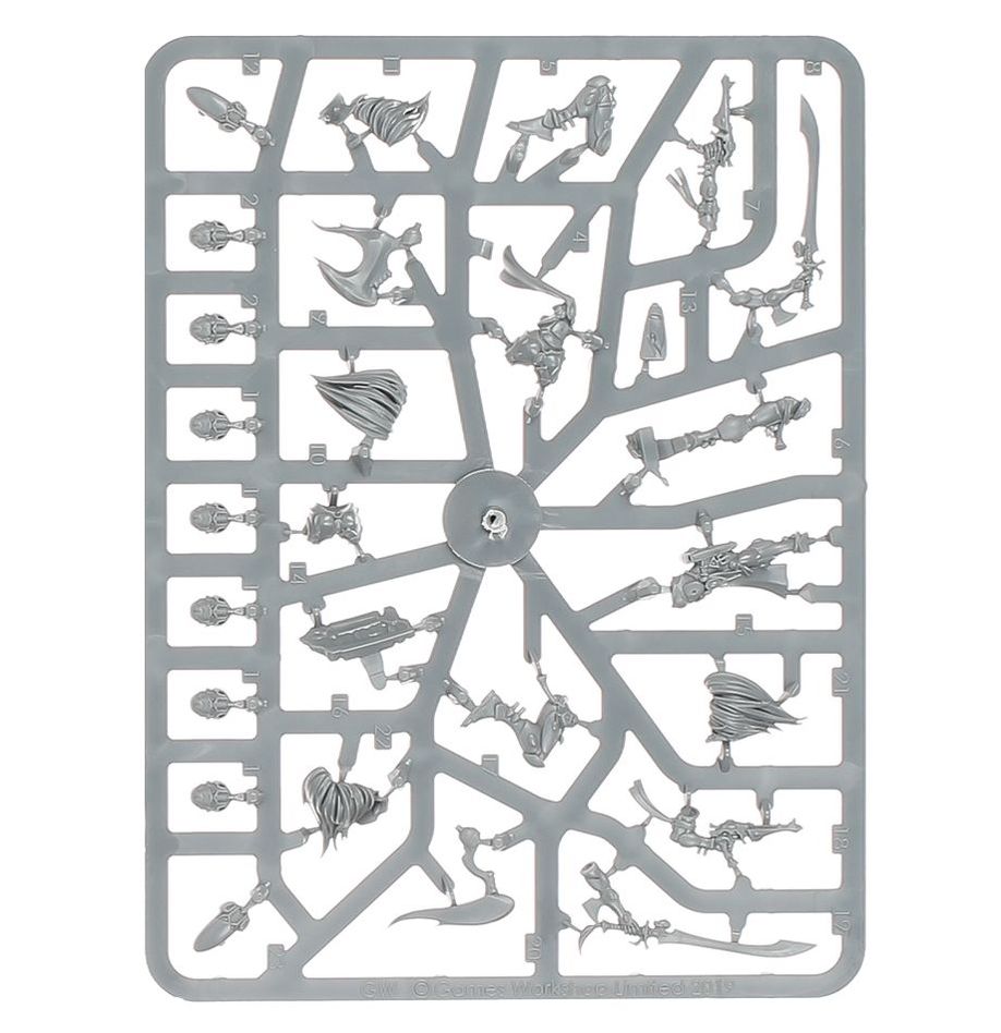 This kit is supplied in 77 plastic components and comes with 5 28.35mm Citadel round bases and a 25mm Citadel round base. It builds either 5 Howling Banshees or 4 Howling Banshees and a Howling Banshee Exarch. The Exarch can be armed with a shuriken pistol and power sword, a shuriken pistol and triskele, a shuriken pistol and executioner or a pair of mirror swords. The Exarch has a choice of four heads and the rest of the squad can be assembled either with helmets or unhelmeted. The kit also includes a single-piece Aeldari symbol that could optionally be used as an objective marker.