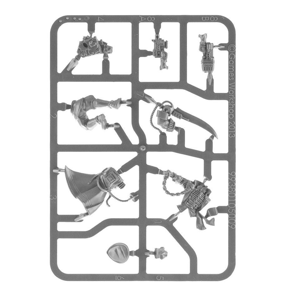 This kit makes one plastic Officio Prefectus Commissar – which can be equipped with either a bolt pistol or plasma pistol at the end of his bionic right arm, while his left hand wields a power sword.