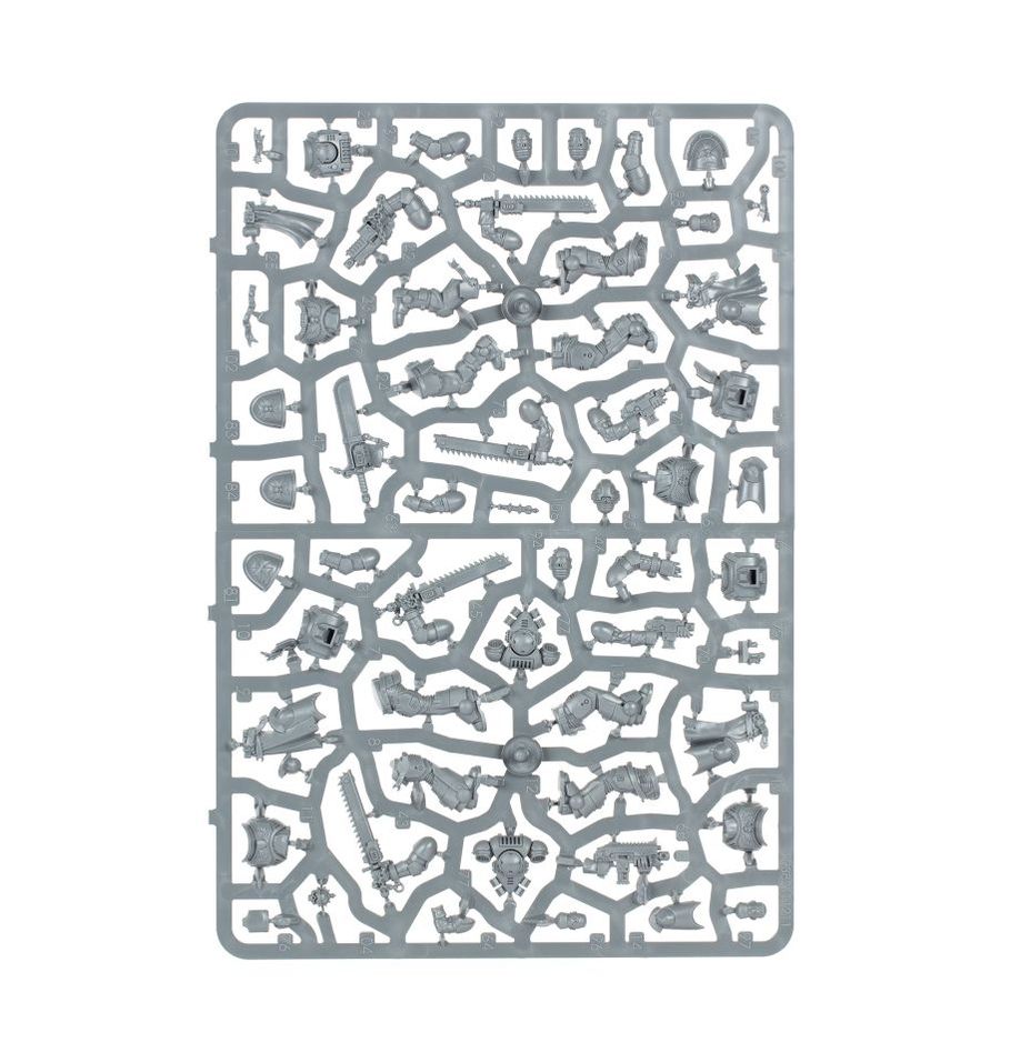 The six Primaris Initiates have a variety of helmeted heads and unhelmeted heads. Two Initiates can be built with a choice of auto bolt rifle or heavy bolt pistol and Astartes chainsword, while the third can be built with an auto bolt rifle, a pyreblaster, or a heavy bolt pistol and an Astartes chainsword, with the option to change the chainsword to a power fist.