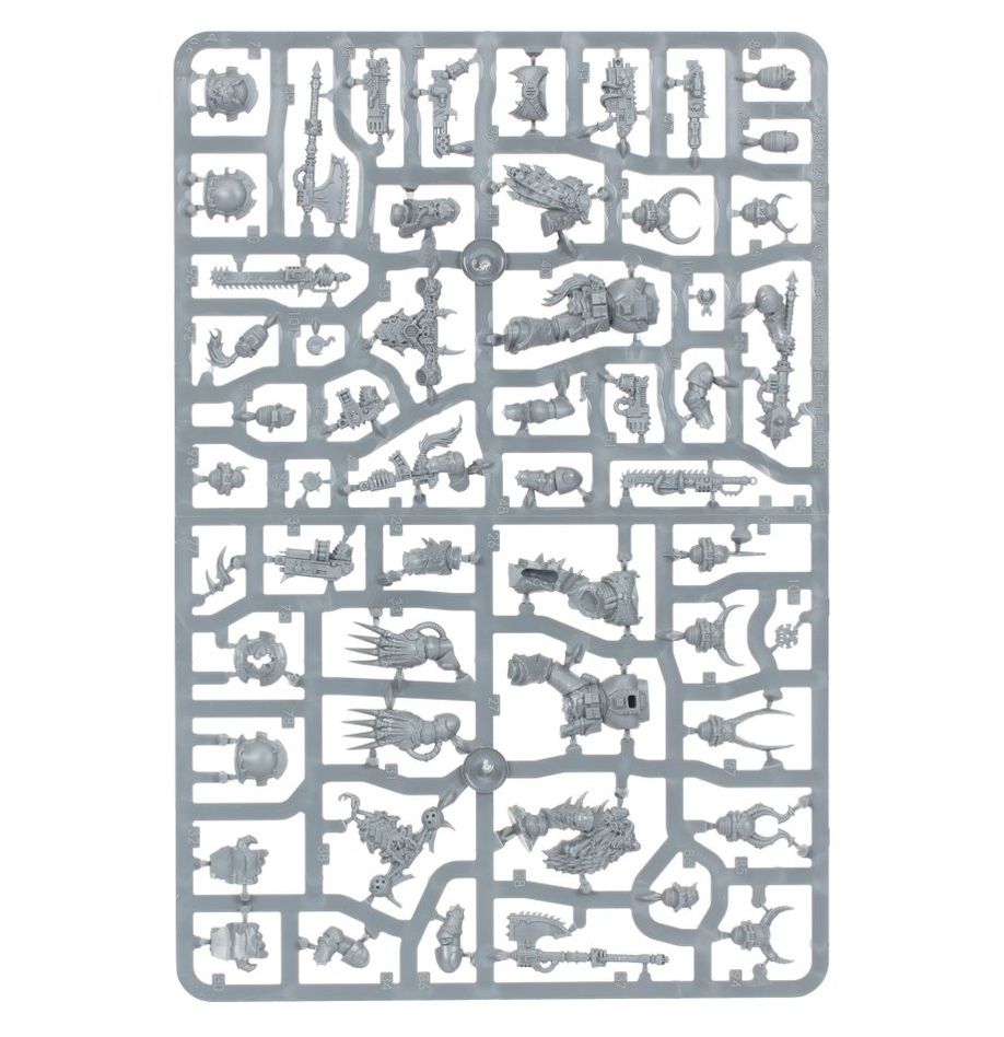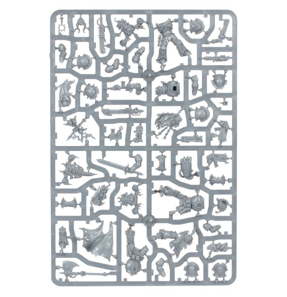 This multipart plastic kit builds five Chosen, hardened Chaos Space Marine warriors who lead the assault on enemy positions. These veterans are armed with a dizzying variety of vicious melee armaments – accursed weapons in the form of chainswords, chainaxes, power fists, lightning claws, and different power weapons – as well as bolt pistols, boltguns, and optional special weapons for blasting chunks out of the foe – two plasma pistols, and two combi-weapons with three configurations each (flamer, melta, or plasma). In addition to cross-compatible weapons, this massively customisable kit offers a huge range of interchangeable cosmetics – including five unique backpacks, 10 unique shoulder pads, 13 unique heads (both bare and helmeted), and various accessories – as well as components to build a Chosen Champion with a choice of chestplates, loincloths, trophies, and a Chaos icon with different symbols for each Chaos God.