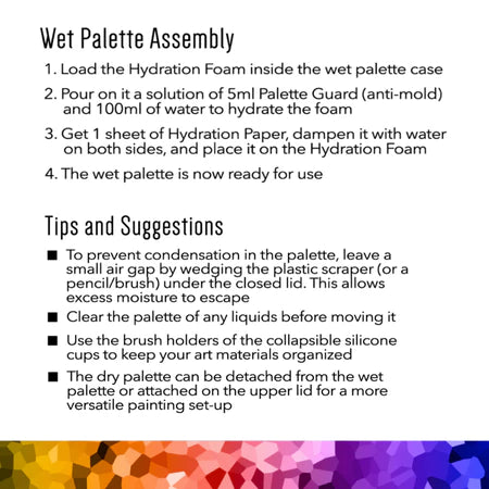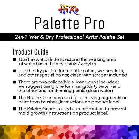 Use the wet palette to extend the working time of waterbased hobby paints/acrylics. Use the dry palette for metallic paints, washes, inks, and other special paints; clean with scraper included. There are two collapsible silicone cups included; we suggest using one for rinsing (dirty water) and the other one for thinning paints (clean water). The Brush Cleaner is used for removing pigments or paint from brushes. Palette Guard is used as a precaution to prevent mold growth.