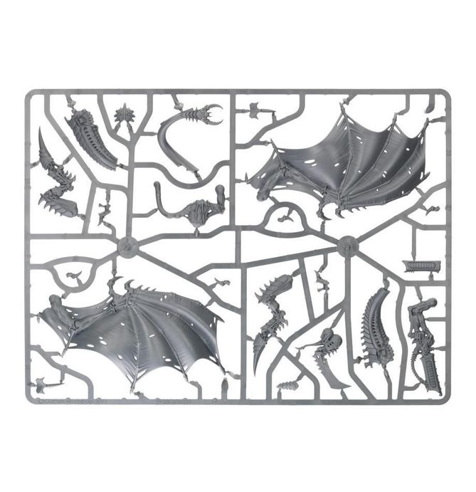 Hive Tyrants enact the Hive Mind's will on the battlefield, as the massive commanders of the Tyranid swarm. Winged Hive Tyrants are spawned to control airborne swarms and provide a mobile synaptic nexus. Wielding an array of nightmarish organic weapons, their monstrous forms singing with the synaptic might of the Hive Mind, these dread swarmleaders spread terror and death wherever the dark shadow of their wings falls.
