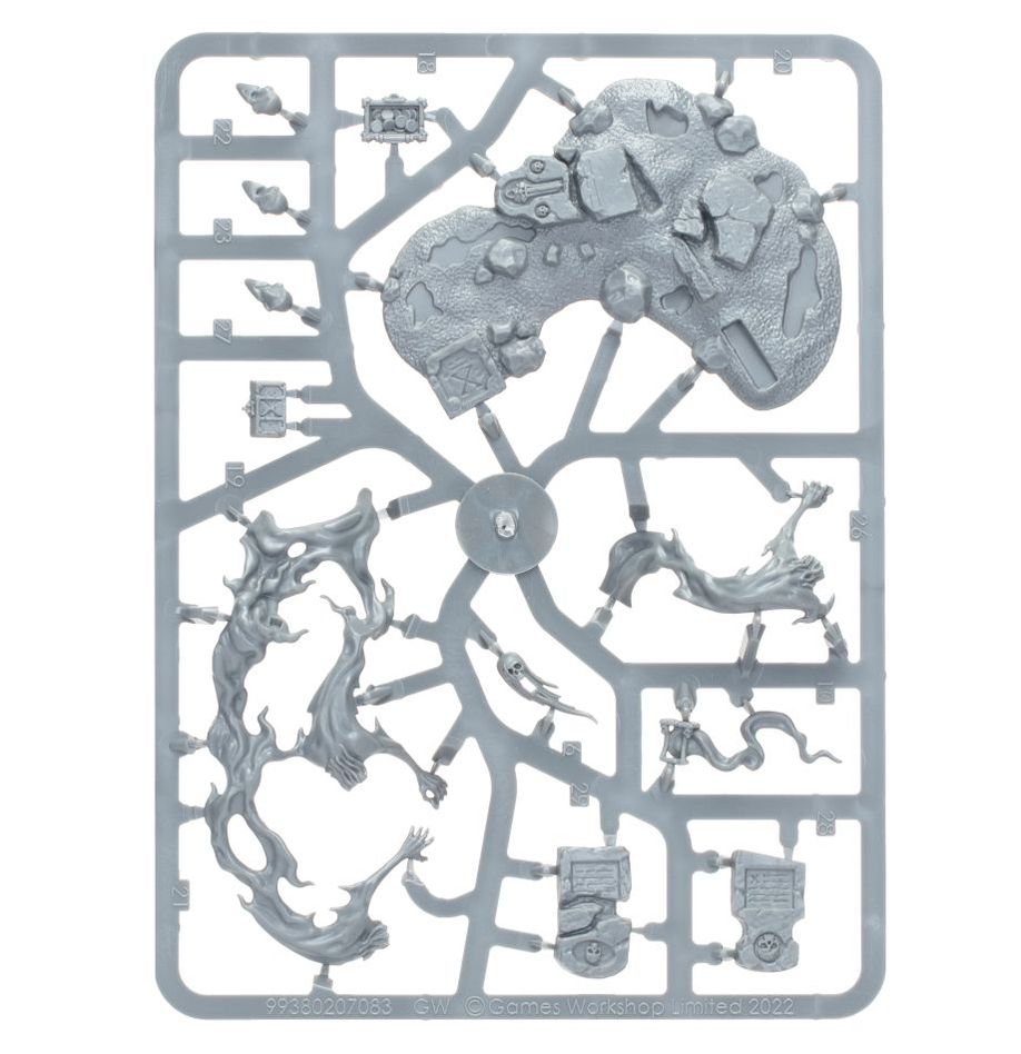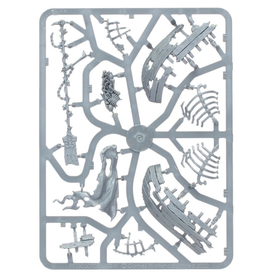This multipart plastic kit builds one Awlrach the Drowner, a unique Hero and Totem for Nighthaunt armies. Propelling his odious, decaying skiff with a deathwood oar, this ghastly figure offers a tremendous boost to his army's mobility by delivering units across the battlefield. He’s also a worthy painting challenge, loaded with grisly nautical details and a variety of textures to experiment with, from rusted iron and rotting wood to vengeful, ethereal spirits.