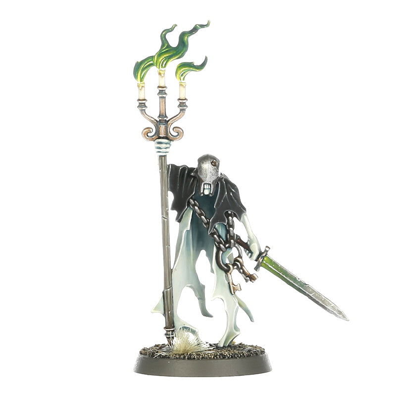 As with many Nighthaunt, the Chainrasp Hordes are little more than wisps of ethereal form willed into reality by sheer force of hatred. Each of these models is essentially a floating hooded cloak, from beneath which a twisted skull-face glares; hung variously from each models’ neck and arms is a heavy length of chain ending in an iron weight, a symbol of their deviant criminal history in life (1 model even has his wrist bound in stocks…) They are armed with malignant weapons – swords, axes and spiked maces – and the kit includes options for a Dreadwarden; this is the unit leader, face locked in an iron helm, carrying a large candelabra along with a set of heavy iron keys.