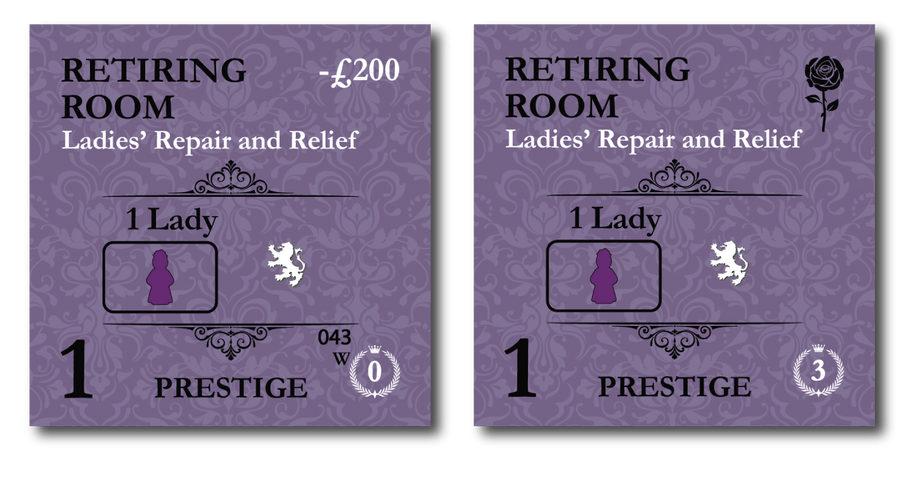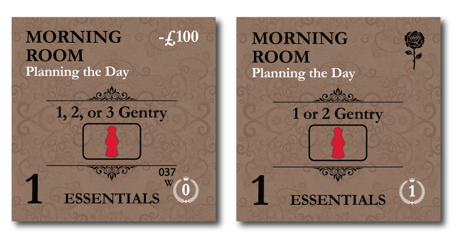 NEW IN THE 2nd EDITION: Unique to the second edition (indicated by 2.1E topped by a crown in the upper right-hand corner of the box) are two new improvement tiles: The Morning Room and Retiring Room.