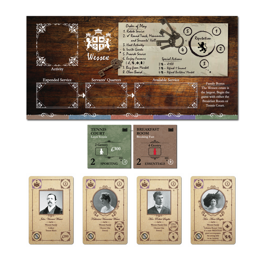 WHAT IT CONTAINS: The Wessex expansion adds a fifth family board that gives the advantage of a larger starting country estate. A player selecting the Family Wessex player board will have their choice between a Breakfast Room and Tennis Court—second level improvements—in his or her manor house at the beginning of the game. The expansion also adds five additional Starter Guests, five additional Casual Guests, five additional Prestige Guests, and six new solo opponents that enable extended play.