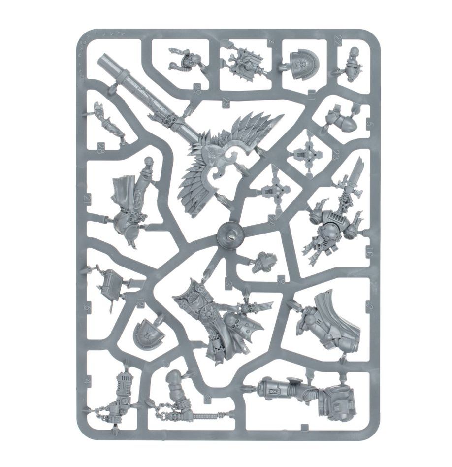 The kit is comprised of 40 plastic components, with which you can assemble one Chaplain Grimaldus and his three Cenobyte Servitors, and is supplied with one Citadel 40mm round base and three Citadel 28mm round bases. These miniatures are supplied unpainted and require assembly – we recommend using Citadel Plastic Glue and Citadel paints.