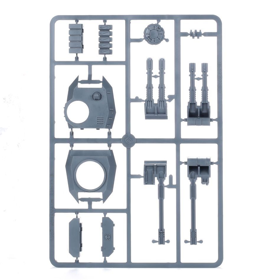 Based upon the Rhino chassis, the Predator sacrifices transport capacity for improved frontal armour and a heavy turret-mounted armament. With this kit you can build a Predator Destructor armed with a turret-mounted autocannon. You have the option of adding two sponson-mounted heavy bolters or two sponson-mounted lascannons. Also included are an optional storm bolter and hunter-killer missile. Alternatively, this model may be built as a Predator Annihilator using the included twin-linked lascannons.