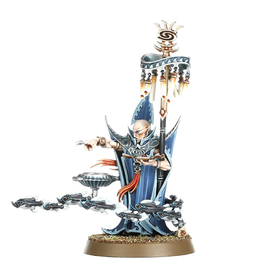 The Idoneth Deepkin are a mysterious race of aelves who dwell within the oceans of the Mortal Realms, emerging from their watery seclusion to plunder the souls of land-dwellers. Guided by the eldritch insight and tidal magics of a Soulscryer, the eyeless Namarti advance into battle, cutting a path for arrogant Akhelian nobles mounted atop deadly aquatic beasts that swim through the air on phantasmal currents.