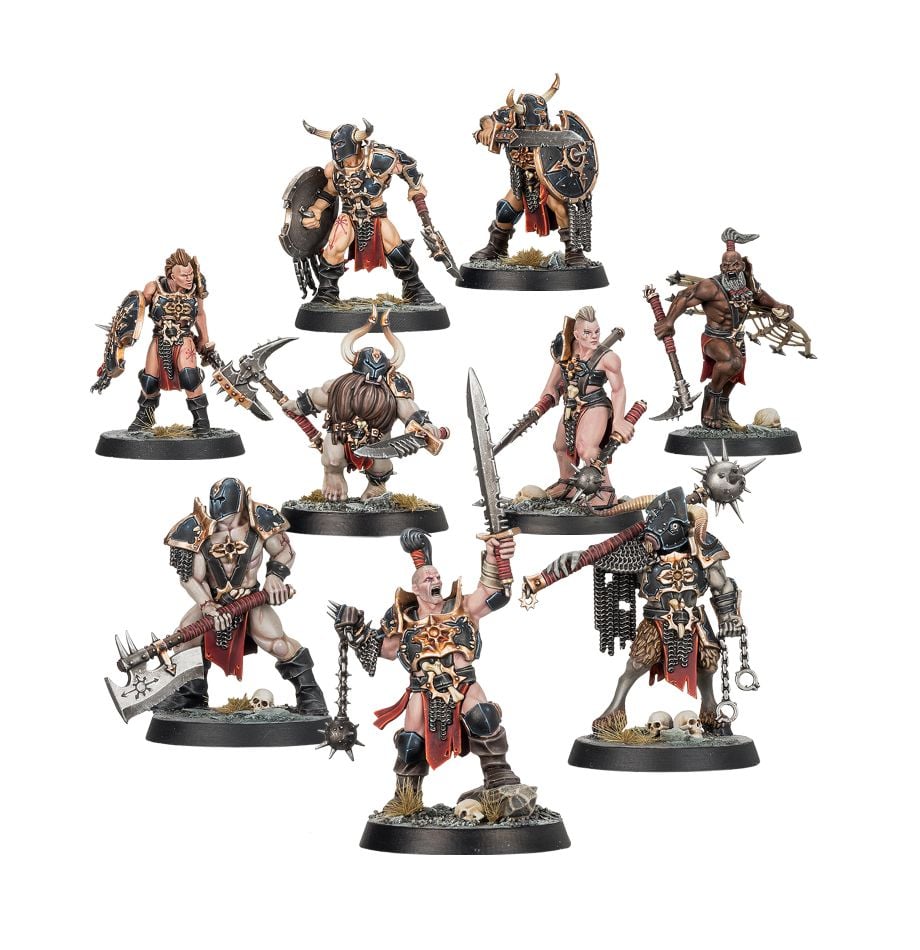 This multipart plastic kit builds a warband of the Spire Tyrants – pit-fighting warriors that can be fielded in Slaves to Darkness armies in Warhammer Age of Sigmar, or used as a complete warband in games of Warcry. Headed up by a bold and brutal Pit Champion, these veteran cultists are clad in gladiatorial armour, and can be armed with a variety of blades, spears, nets, and shields to excel on the battlefield and win fame in the eyes of their warlords.