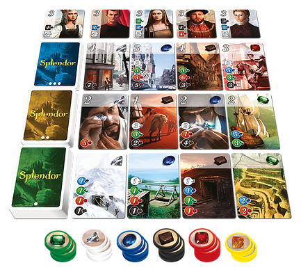 Splendor is a game of chip-collecting and card development. Players are merchants of the Renaissance trying to buy gem mines, means of transportation, shops—all in order to acquire the most prestige points. If you're wealthy enough, you might even receive a visit from a noble at some point, which of course will further increase your prestige.