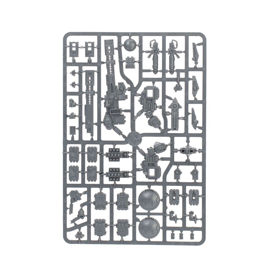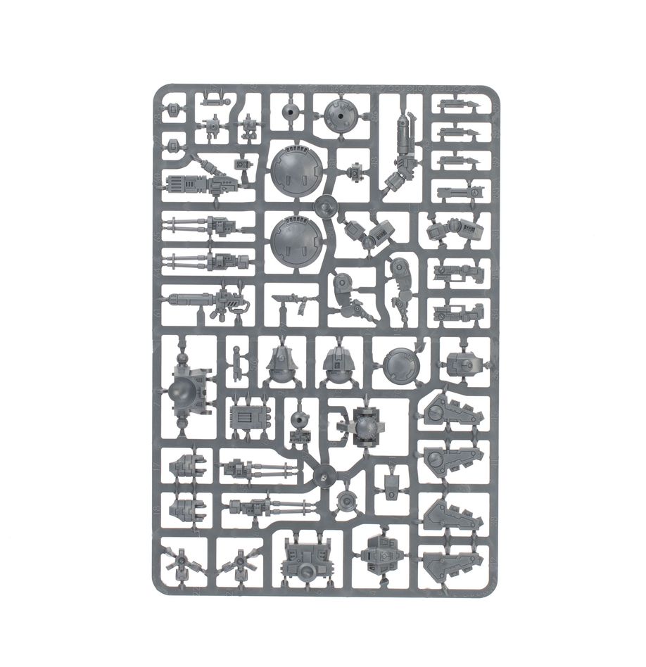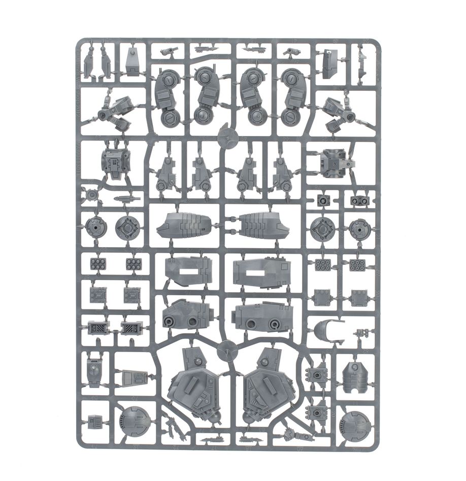 The Crisis Battlesuits can each be built on the ground or with flying stems as if just landing or taking off. The heads, knee pads, and shoulder pads are interchangeable, as are the weapons – there are four plasma rifles, three T'au flamers, four fusion blasters, four burst cannons, three missile pods, and three shield generators. The six drones can be built as up to three gun drones, up to three shield drones, and up to three marker drones. There are also parts to build an optional Shas'vre or Iridium-class XV8-02 Crisis Battlesuit.