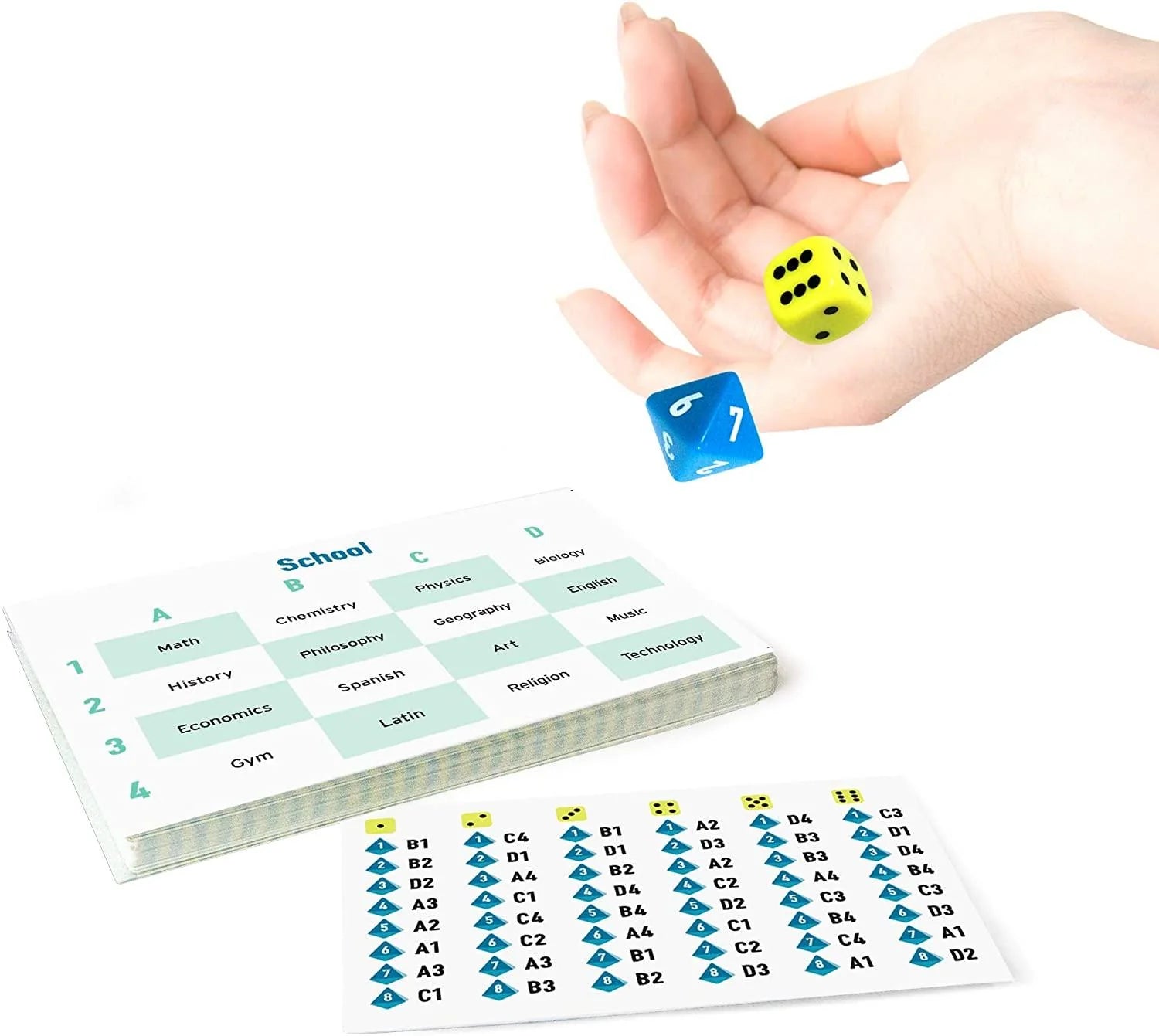 At the beginning of the round each player receives a card that tells them if they are the Chameleon or hunting the Chameleon. Two dice are rolled and this gives everyone (except the Chameleon) the coordinates to a specific word on a Topic Card – this is the Secret Word for the round. Each Topic Card features 16 related words (e.g. countries, books, food, etc.)