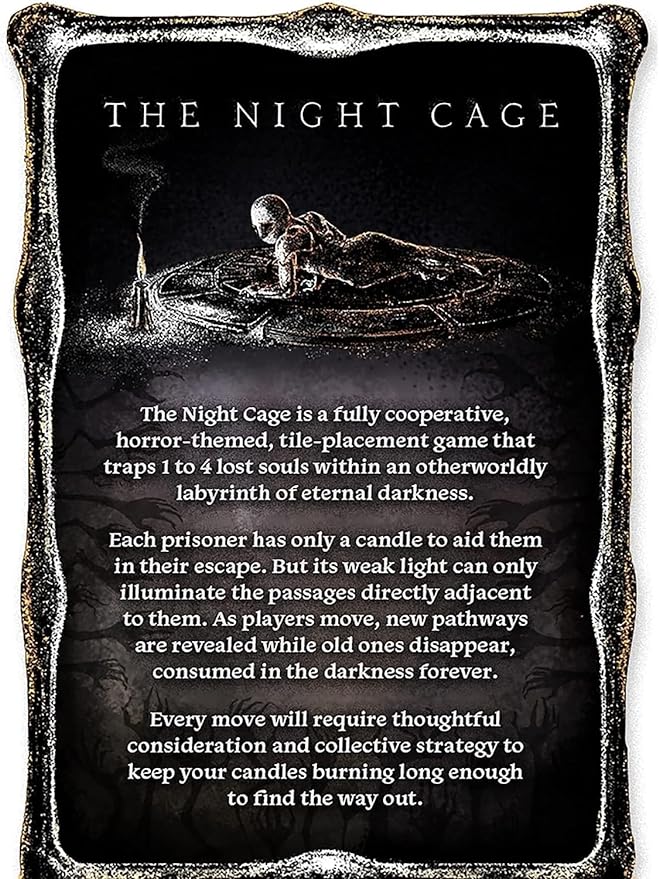 The Night Cage is a cooperative, horror-themed tile placement game that traps 1-5 lost souls within an otherwordly labyrinth of eternal darkness. Equipped with nothing but dim candles, you must work together to explore the maze and escape. To win, players must each collect a Key, find a Gate, and escape as a group. But escape won’t be easy. The weak glow of your candle sheds light on only a small area of the maze at a time. As players move, new pathways are revealed while old ones disappear forever into the darkness, creating an ever-changing play space that requires teamwork and collective strategy to navigate.
