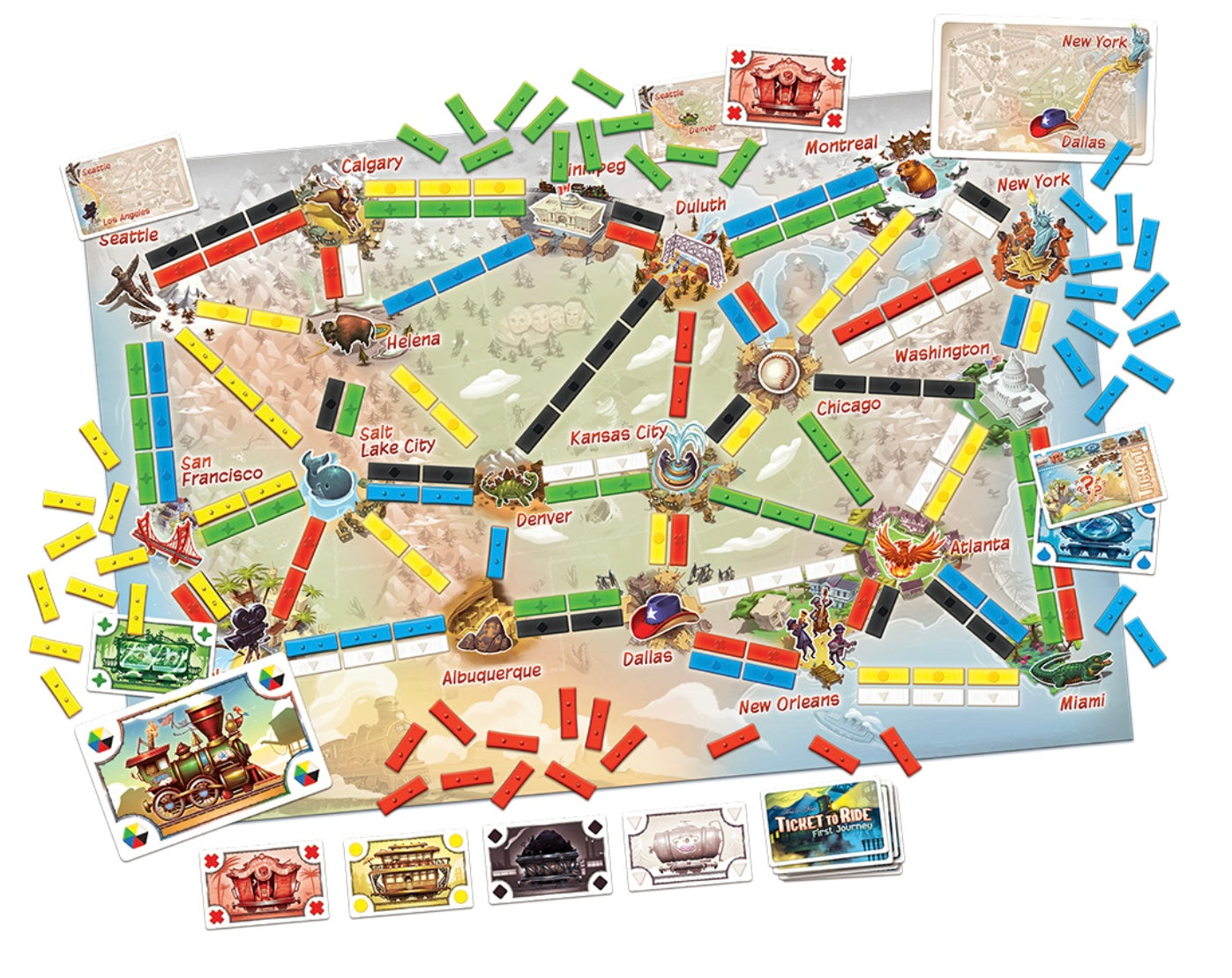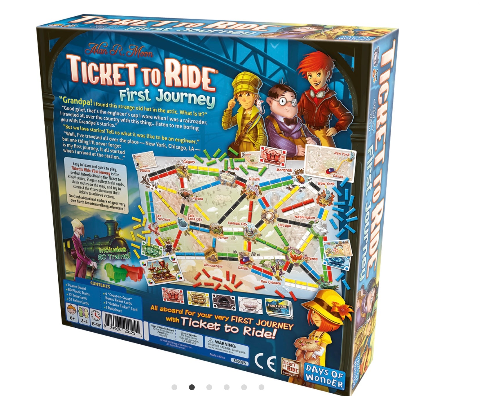 Players of all ages can now venture across America by train in Alan R. Moon's Ticket to Ride: First Journey! With a brand-new map and simplified rules, First Journey is the perfect way to introduce new players to the game of cross-country travel. Just like in Ticket to Ride, players collect train