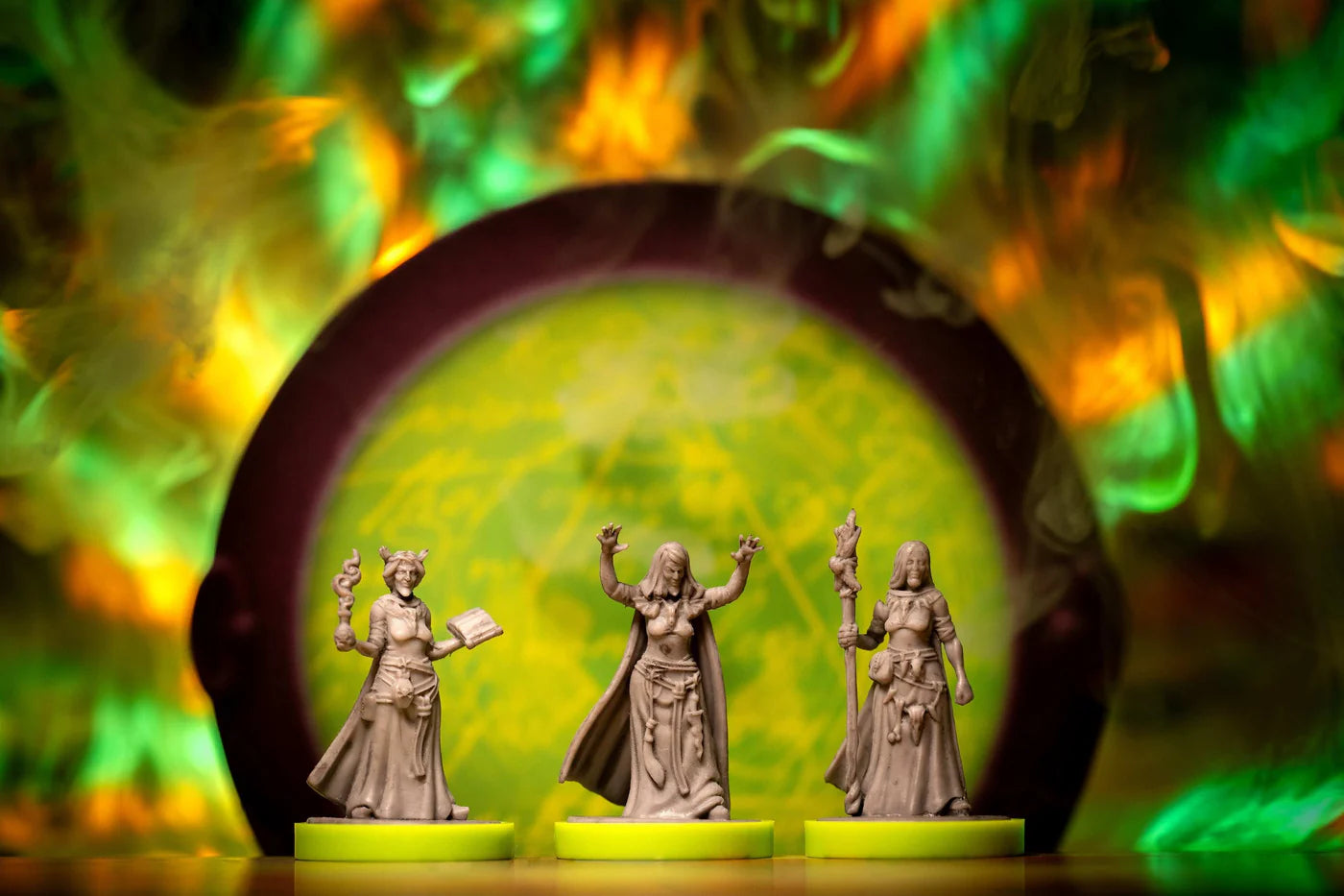 All the world's a stage in Unmatched: Slings & Arrows, while the Globe Theater is a battlefield. William Shakespeare steps up to the fight along with three of his wondrous characters: The Wayward Sisters, Hamlet, and Titania. Shakespeare's deck, designed by Jonathan Guberman, was one of the winning decks in a 2020 design competition, and it rewards players for completing lines in iambic pentameter. The Wayward Sisters, a runner-up in that competition from Jason Hager, is a multi-hero deck that challenges you to bring the witches' potion machinations to life with cunning co-ordination.